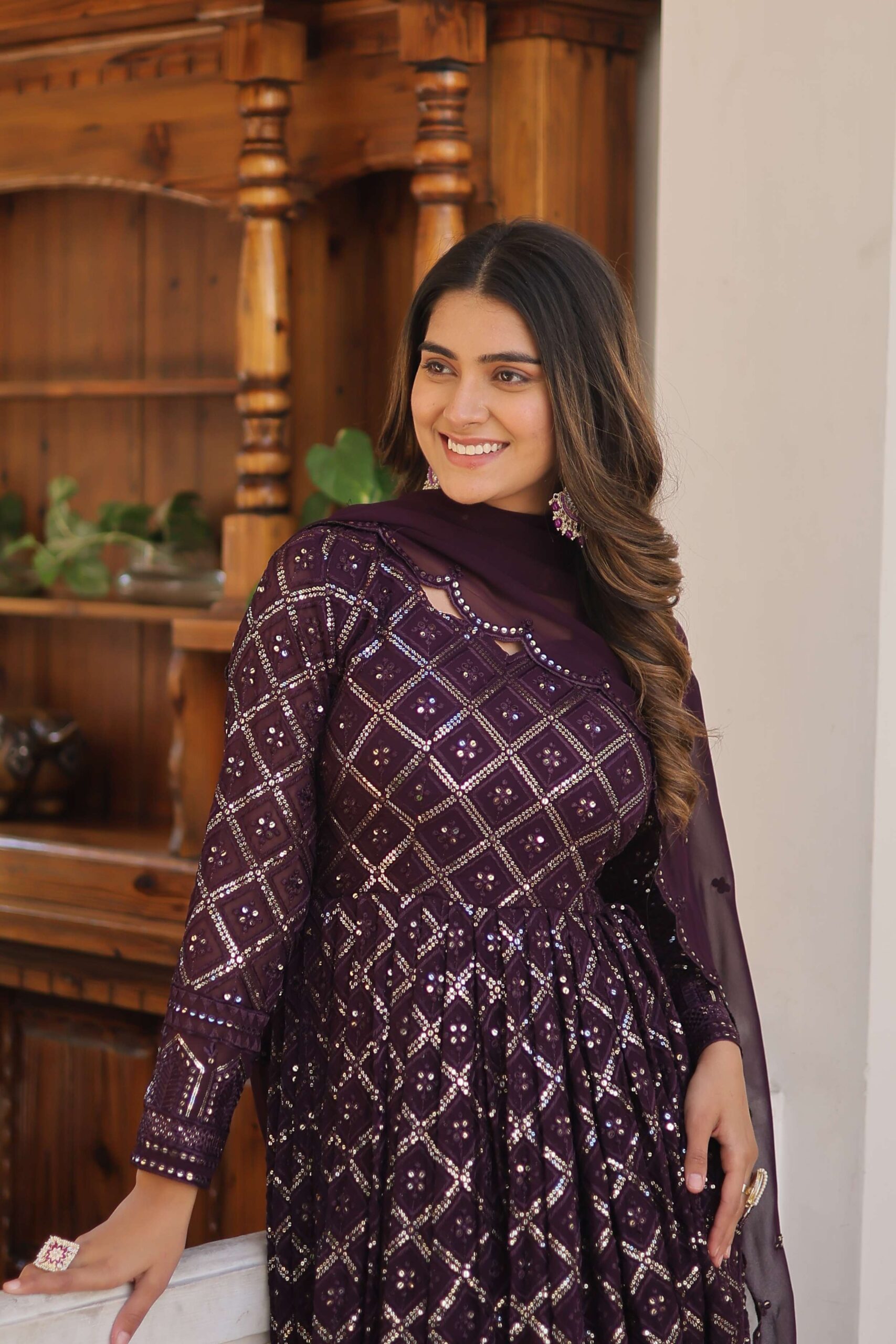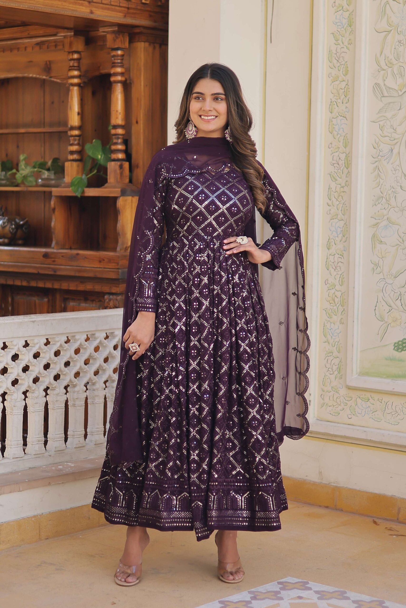 Step into sophistication with this premium Faux Georgette gown-dupatta set. Crafted from high-quality Faux Georgette fabric, the gown is adorned with intricate embroidery and multi-sequins detailing, featuring a round neck, full sleeves, and a 12-meter flowing flair with three-layer frill stitching.